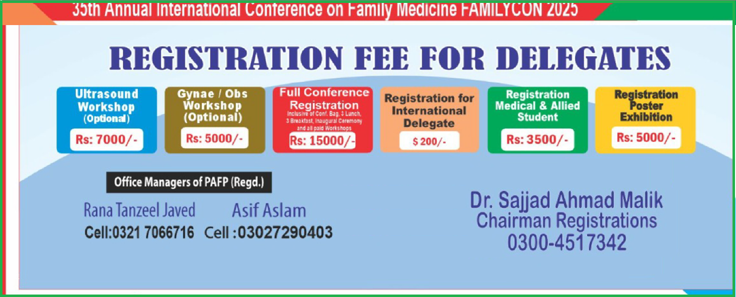 Doctors seeking registration are requested to contact Conference Secretariat. Please write you cheque in favor of “Academy of Family Physicians Pakistan” and send it to 196-Atta Turk Block New Garden Town Lahore